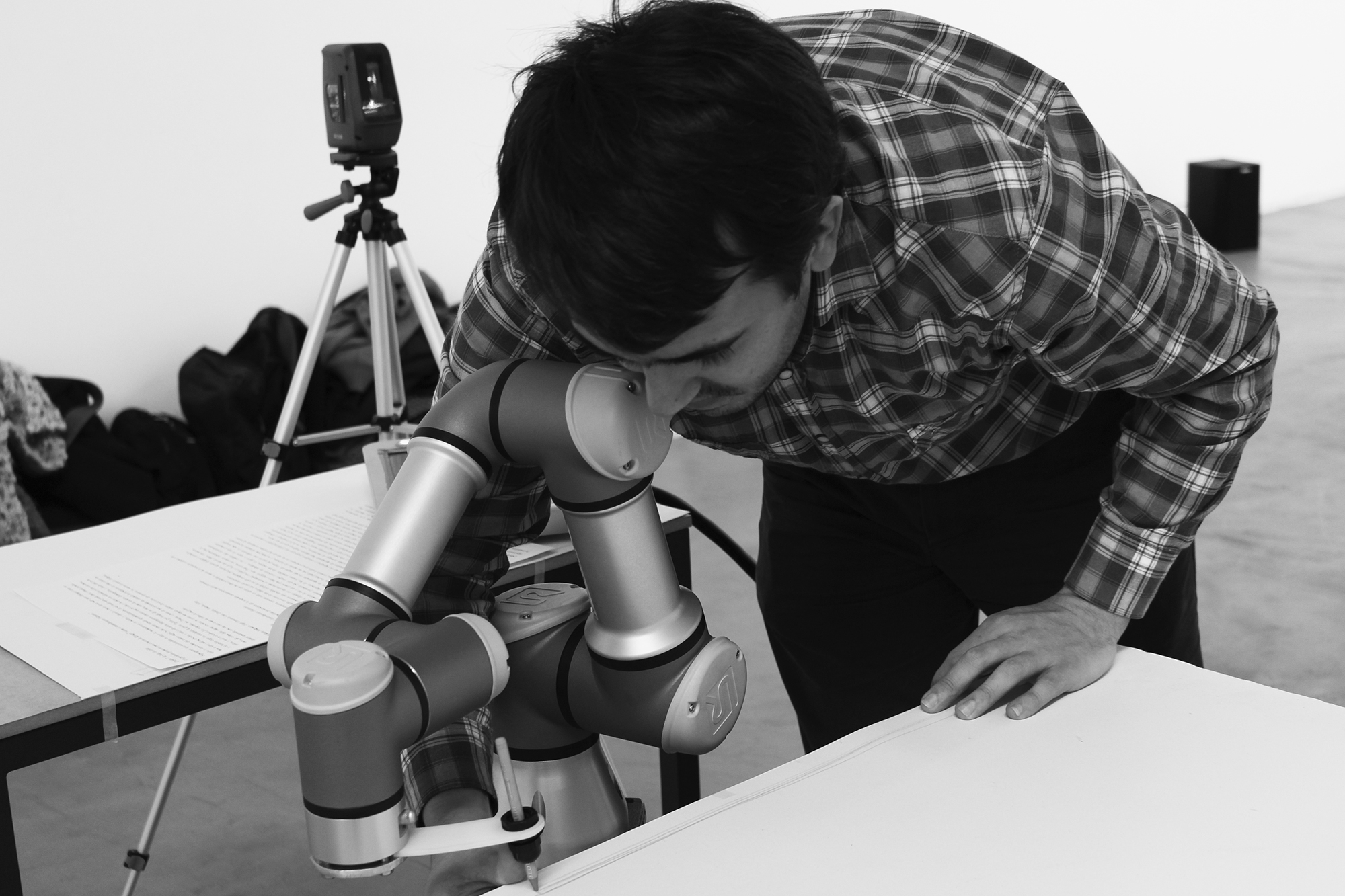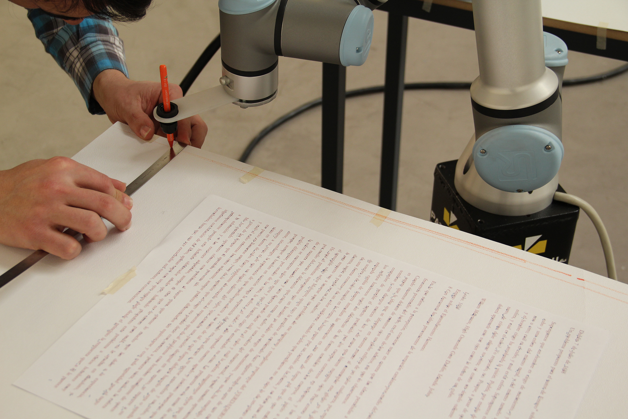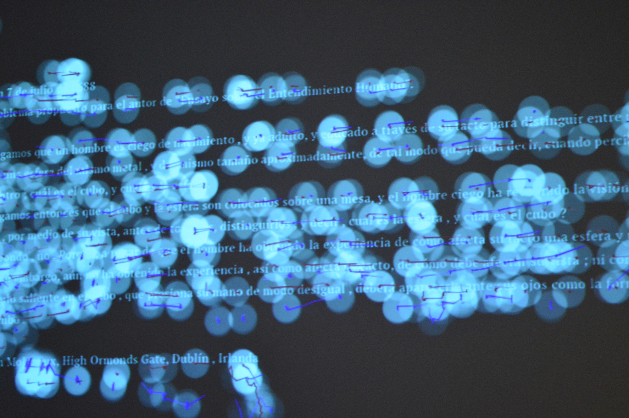 People were invited to read a piece of text about William Molineux’s problem formulated John Locke in 1693. An eye tracker device allowed us to see the very specific word syllables reached by the eyes. Syllables were recorded and sent to a robotic arm for each reader. The robot erases those pieces of text were the eyes posed. According people reads the text time and time again, the robot will erase the text more and more. |