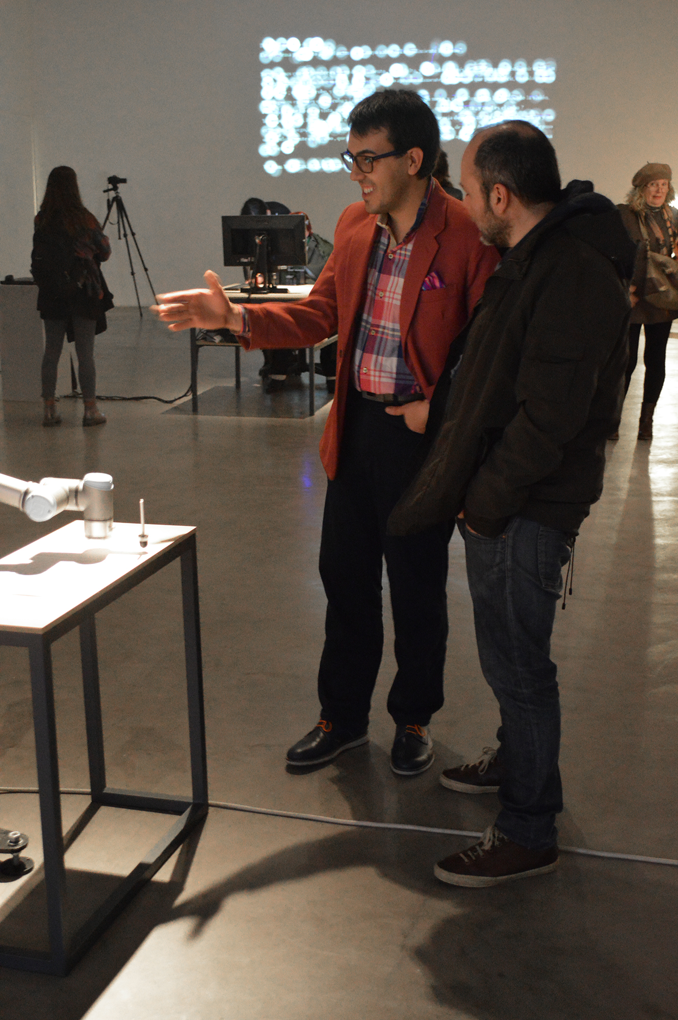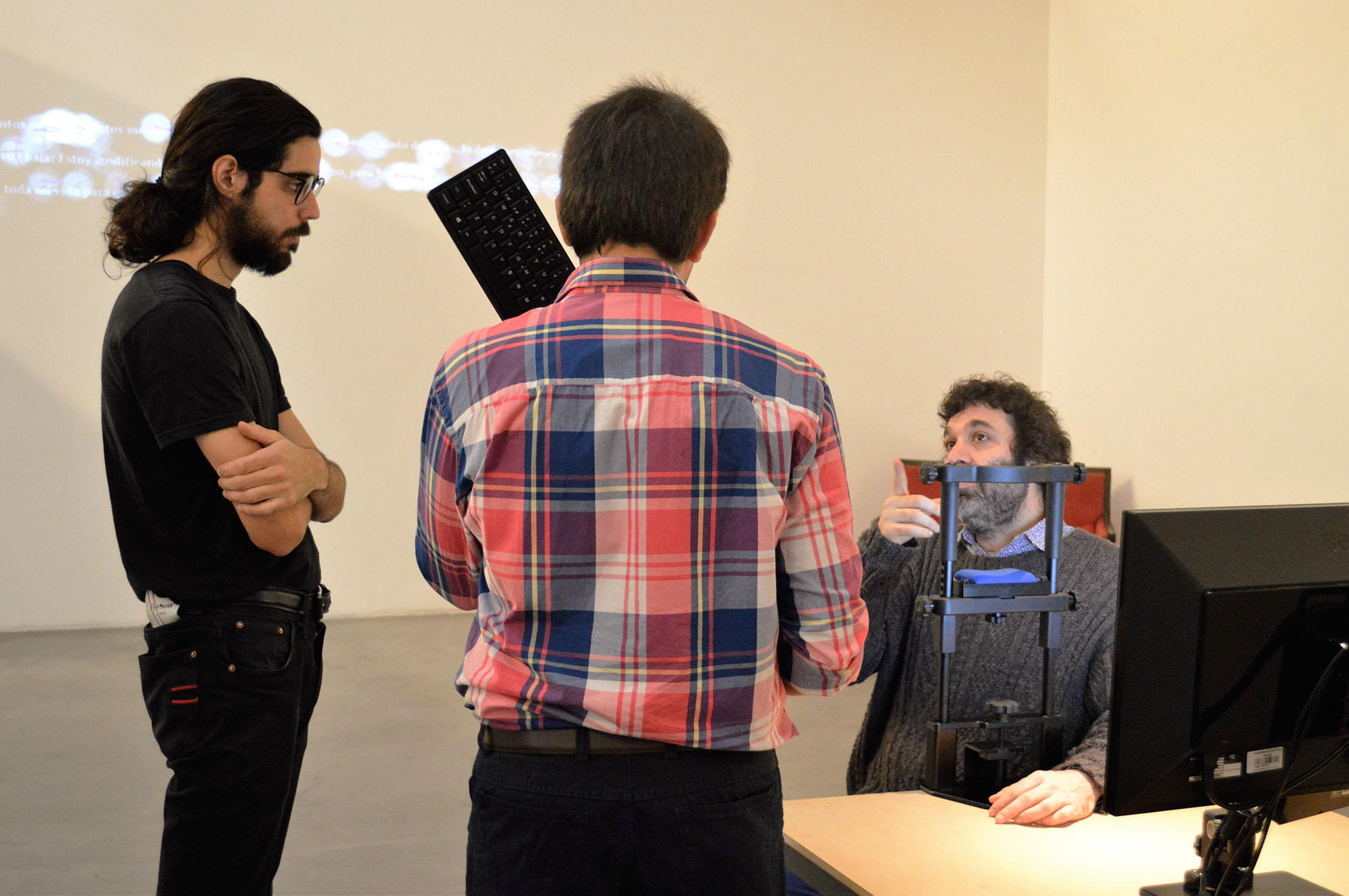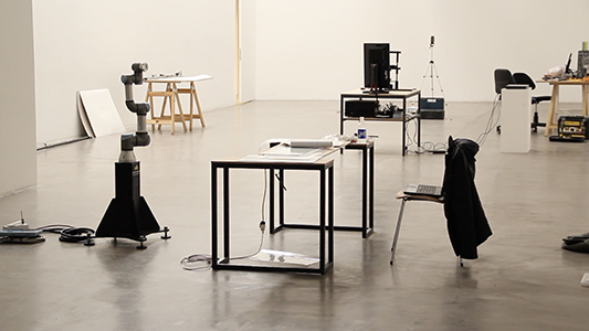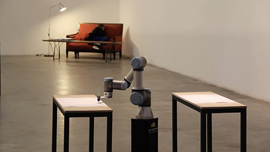People were invited to read a piece of text about William Molineux’s problem formulated John Locke in 1693. An eye tracker device allowed us to see the very specific word syllables reached by the eyes. Syllables were recorded and sent to a robotic arm for each reader. The robot erases those pieces of text were the eyes posed. According people reads the text time and time again, the robot will erase the text more and more. |