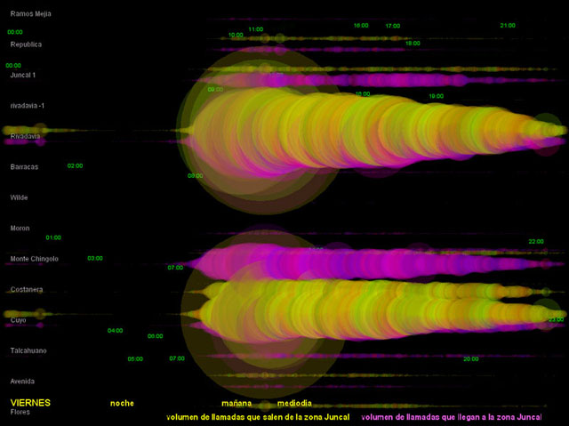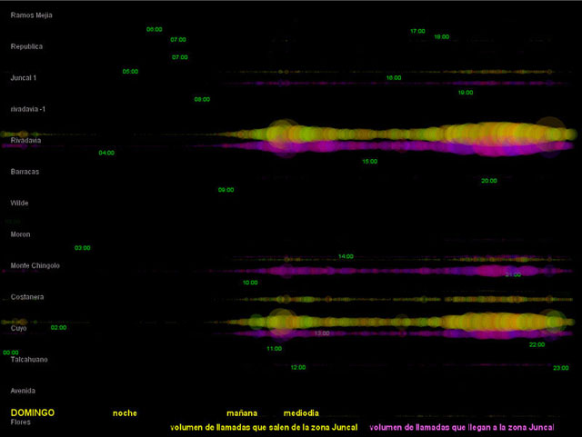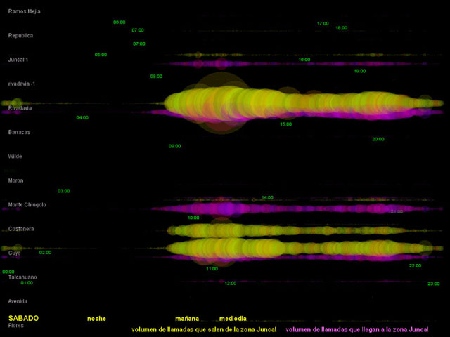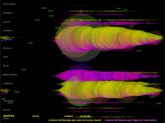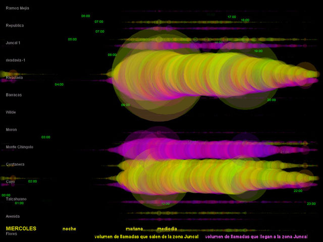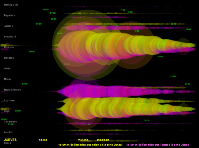 El diámetro de los círculos depende del volumen de tráfico registrado en la central. Los círculos amarillos corresponden a las llamadas hechas desde la zona de Recoleta hacia otros lugares. Los círculos magenta corresponden al tráfico de llamadas que llegan a la zona.
