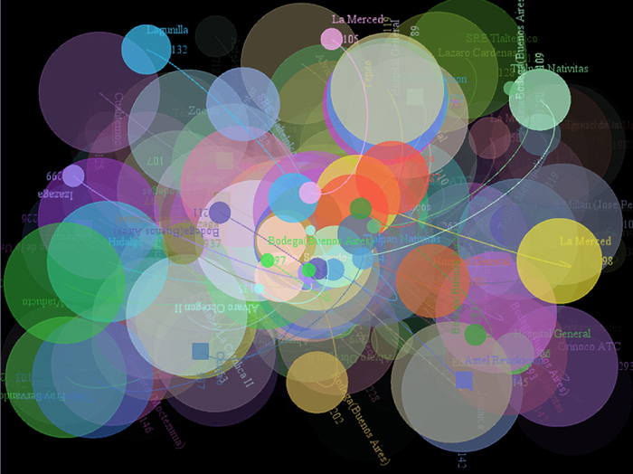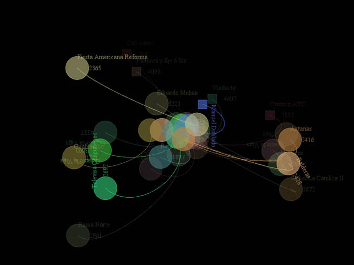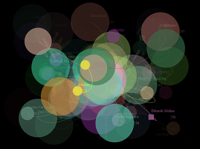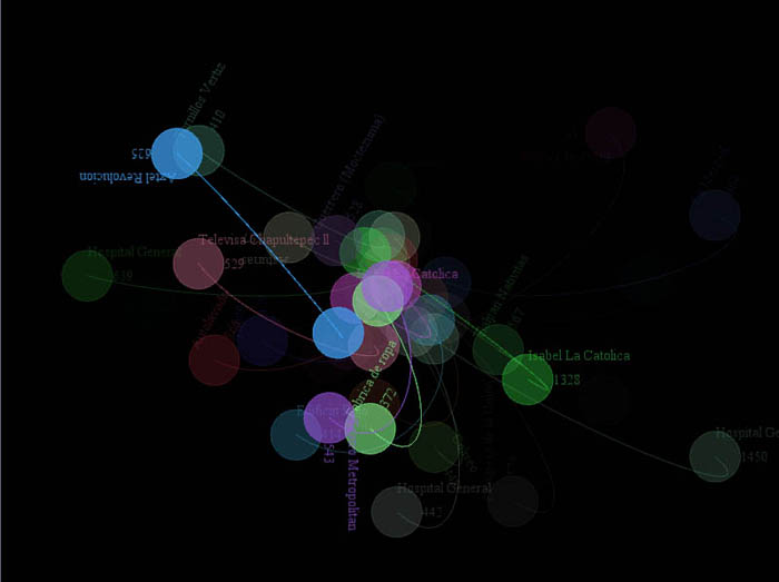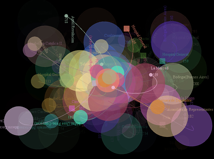 La visualización muestra las llamadas que se están realizando en la zona del Zócalo mediante círculos que se agrandan mientras dura la comunicación. El tráfico de llamadas fué procesado por Telefónica de México usando las antenas de la región del Zócalo. La información fué transmitida por una red a la computaodra de la visualización ubicada e el Centro Cultral de España en el Zócalo. Los colores y etiquetas indican las direcciones y regiones conectadas en ese momento a través de la llamada en curso. |