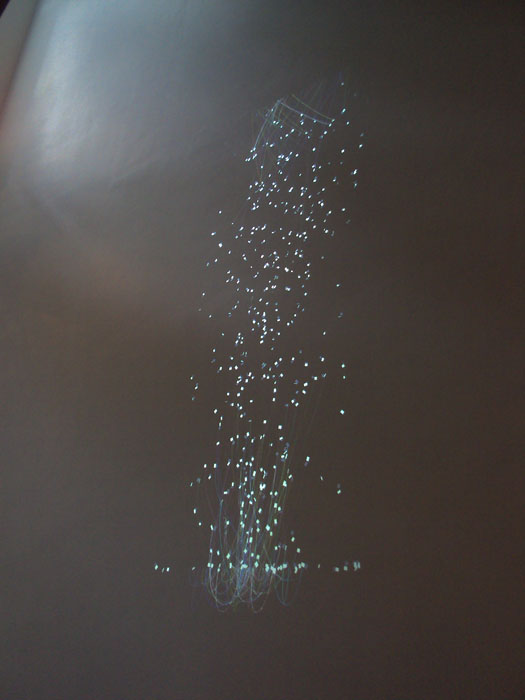 Se trata de una proyección de 12 metros de alto x 4 metros de ancho en la que cada llamada realizada en el Zócalo es representada por un papelito animado digitalmente que se vuela. El Zócalo es representado por una línea imaginaria de la que emergen papelitos cada vez que alguien realiza una llamada desde la zona. Inversamente, papelitos caen hacia esa línea imaginaria cada vez que alguien recibe una llamada en el Zócalo. |